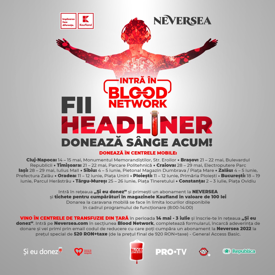 BLOOD NETWORK, cea mai longevivă campanie de donare de sânge din România, inițiată de organizatorii UNTOLD și Neversea, îi așteaptă din nou pe eroi să salveze vieți și să se bucure de experiențe de neuitat la unele dintre cele mai mari festivaluri de muzică din lume. Ajunsă la cea de-a 8-a ediție, campania de donare de sânge BLOOD NETWORK se desfășoară în 2022 în perioada 14 mai – 3 iulie 2022 în toate centrele de transfuzii din țară și în caravanele mobile. Nevoia de sânge pentru salvarea de vieți persistă în spitalele din țară. În România e nevoie anual de peste 500.000 de unități de sânge.