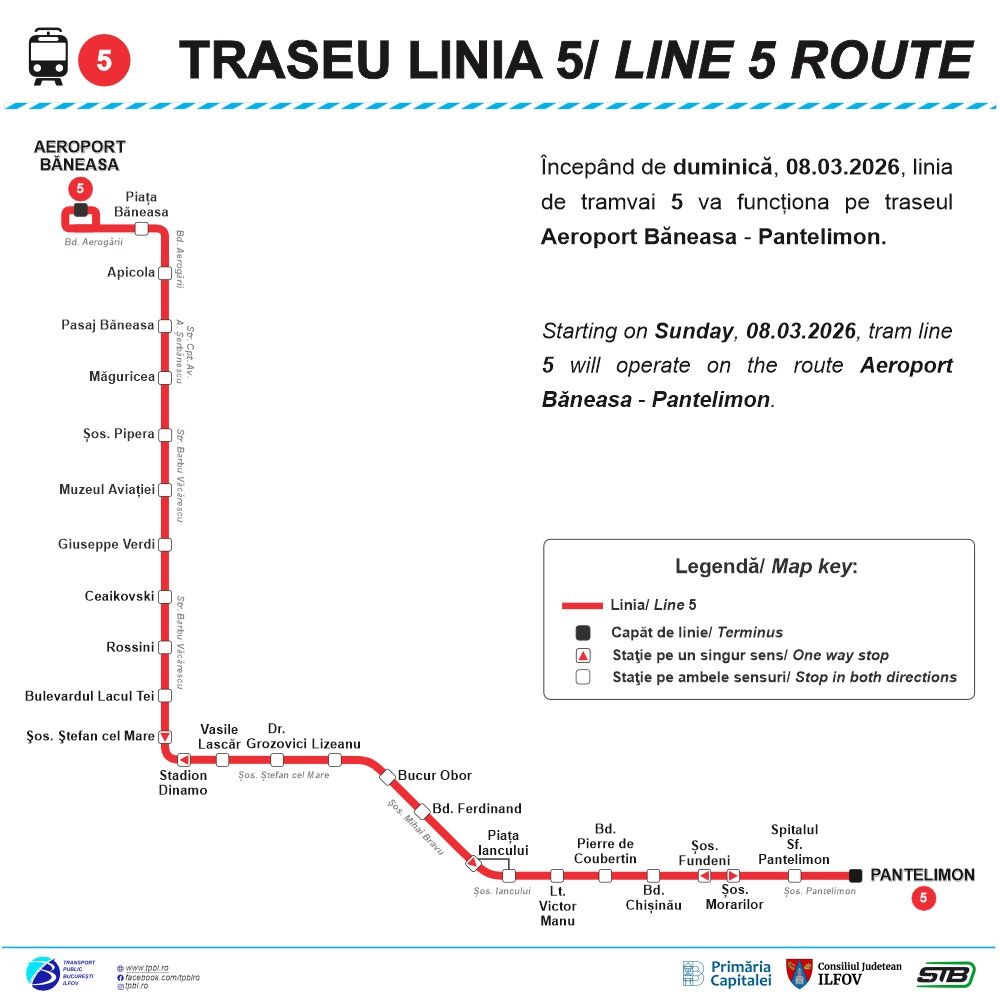 „Linia 5 de tramvai va reveni în traseu începând de duminică, 8 martie 2026, de la ora 12:00, asigurând o legătură directă de transport între Nordul și Estul Capitalei. Având în vedere lucrările de reabilitare a căii de rulare a tramvaielor de pe Str. Paleologu, Str. Armand Călinescu și Str. Vasile Lascăr, linia 5 (pe care vor circula vehicule moderne, inclusiv tramvaie noi Astra Imperio Metropolitan) nu va mai putea ajunge la Piața Sfântul Gheorghe, ci va funcționa între terminalele Aeroport Băneasa și Pantelimon”, a informat Asociația de Dezvoltare Intercomunitară pentru Transport Public București – Ilfov (TPBI).