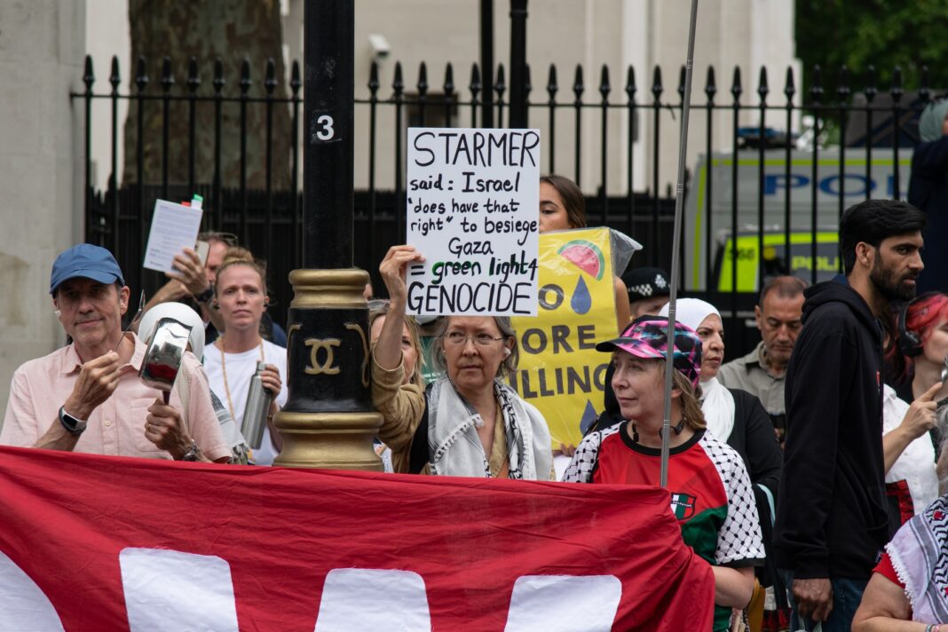 Londra, Marea Britanie, 29 iulie 2025 – Protestatari în fața Downing Street, cerând încetarea foametei din Fâșia Gaza și recunoașterea Palestinei ca stat de către Marea Britanie.