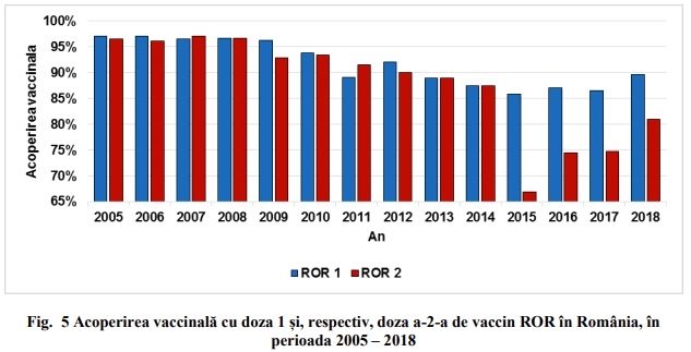 Dr. Mihai Craiu a prezentat atunci, în cadrul unui eveniment organizat de Colegiul Medicilor din România, cea mai recentă situație a vaccinării ROR la copii disponibilă în țara noastră- un raport al Centrului Național de Supraveghere și Control al Bolilor Transmisibile din cadrul Institutului Național de Sănătate Publică, publicat în anul 2019.