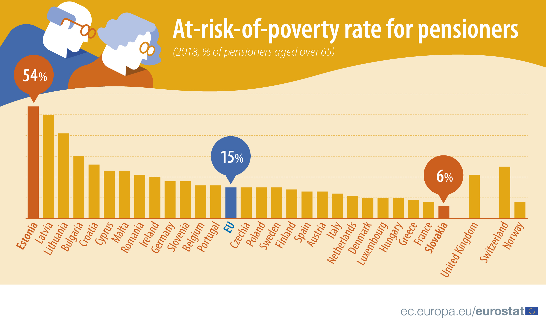Cele patru state membre UE care înregistrau, în 2018, un grad al riscului de sărăcie mai mare de 30%, pentru pensionari, au fost Estonia (54%), Letonia (50%), Lituania (41%) și Bulgaria (30%).