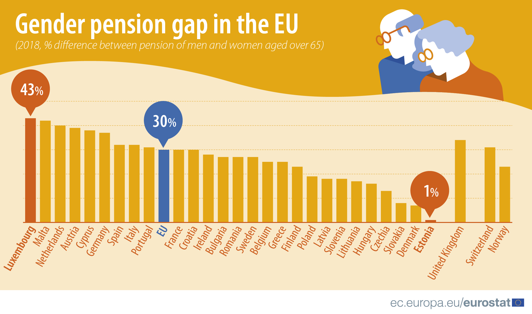 Cea mai mare diferență a pensiilor acordate în funcție de gen a fost înregistrată în Luxemburg, unde femeile cu vârsta de peste 65 de ani au primit o pensie cu 43% mai mică decât pensia primită de bărbați. În clasament urmează Malta (42%), Olanda (40%), Austria (39%), Cipru (38%) și Germania (37%).