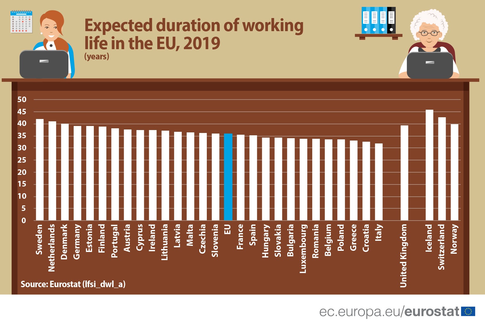 La nivelul statelor din cadrul Uniunii Europene durata medie de lucru preconizată de-a lungul vieţii a fost de 35,9 ani.