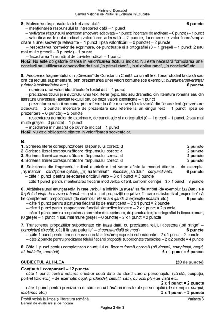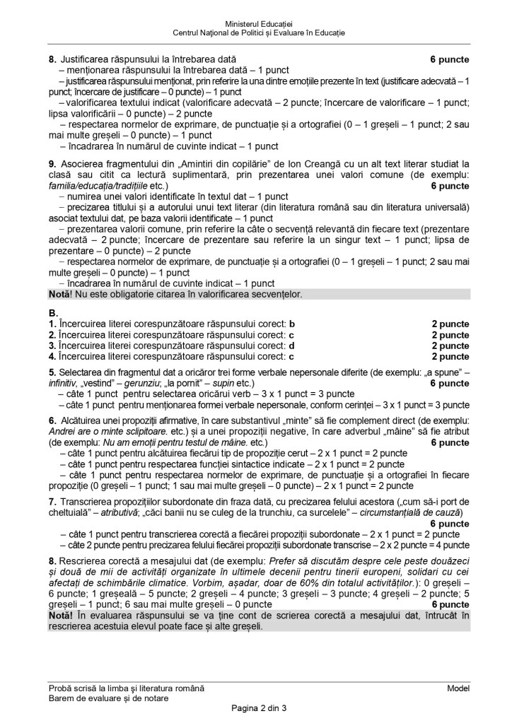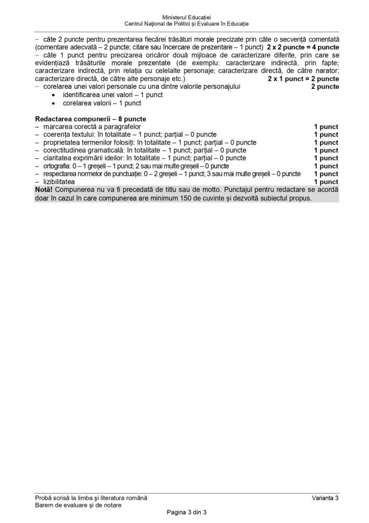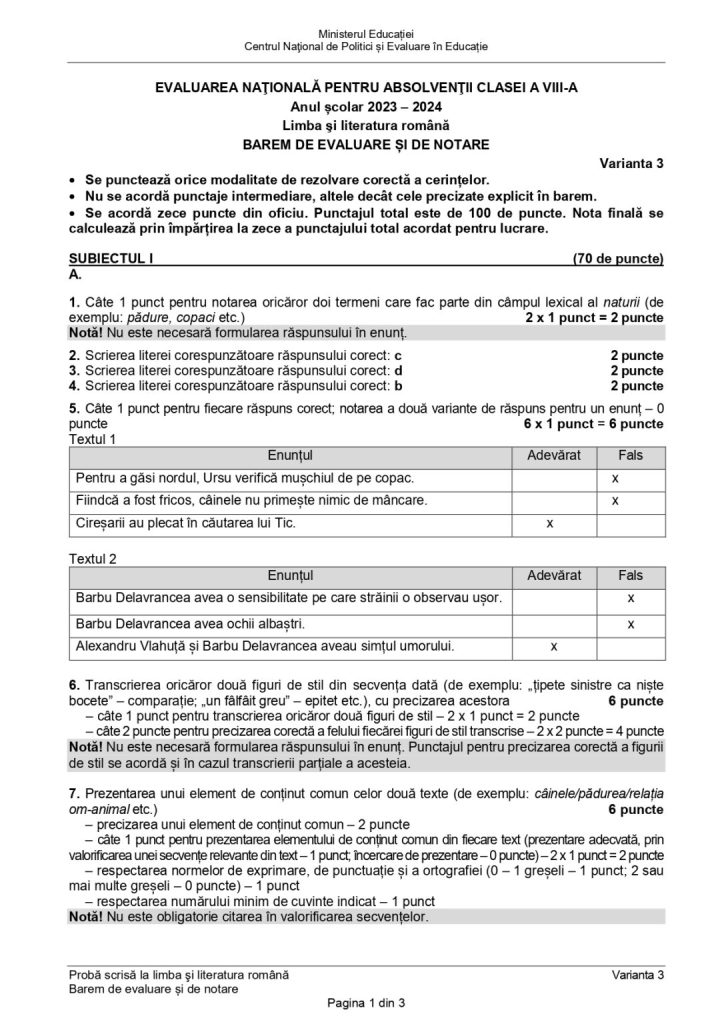 Barem de evaluare Limba și literatura română Evaluarea Națională 2024: