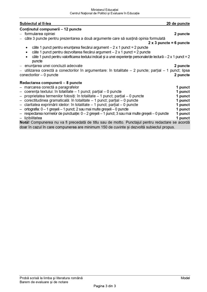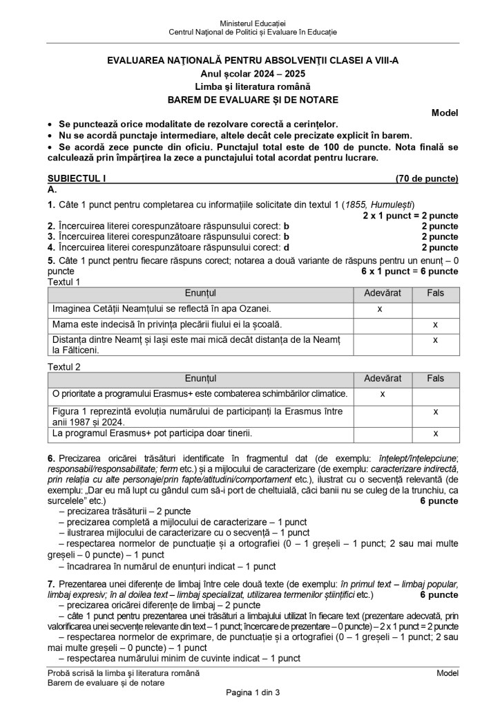 Barem de evaluare pentru Model Evaluarea Națională 2025, Limba și literatura română: