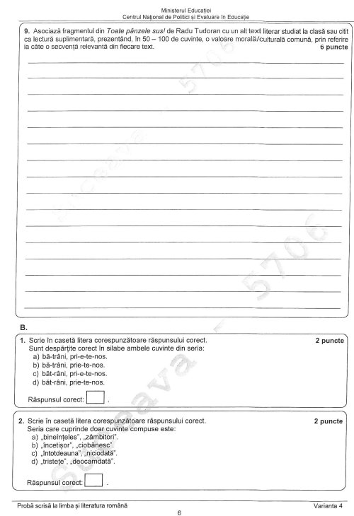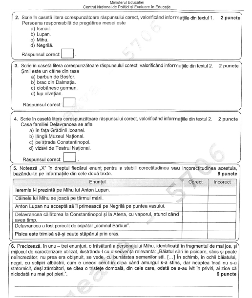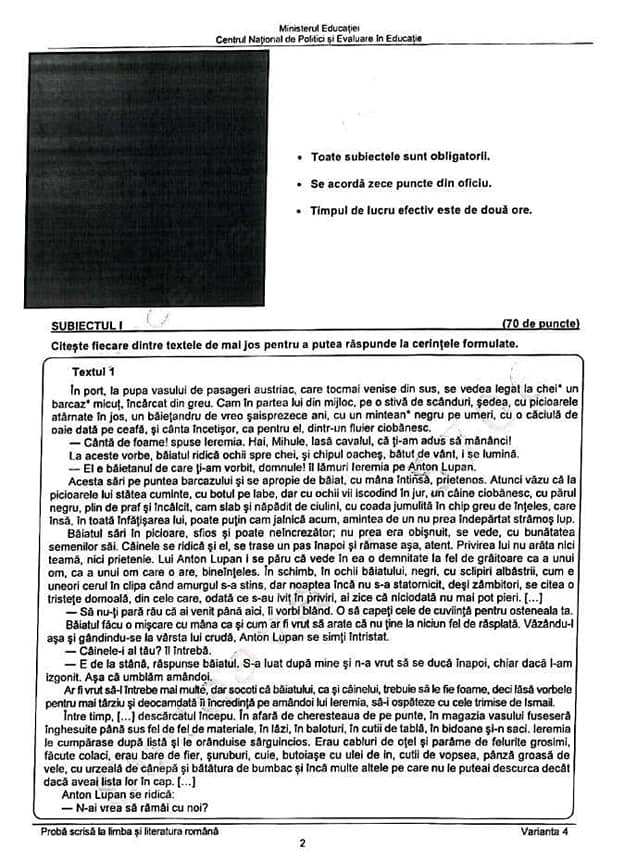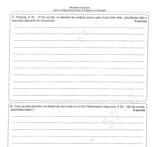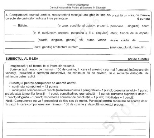 La subiectul al doilea, elevii clasei a VIII-a au avut de redactat un text narativ, de maximum 150 ce cuvinte, în care să prezinte cea mai frumoasă întâmplare din vacanță. Textul trebuia să includă o secvență descriptivă și o secvență dialogată.