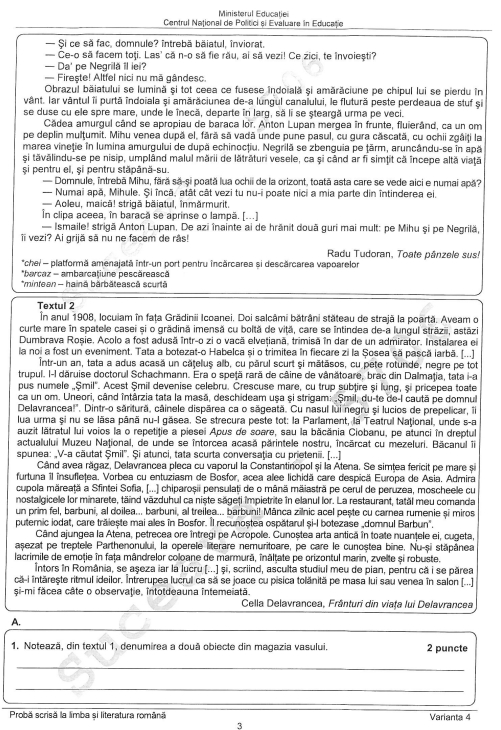 Elevii care au susținut marți examenul la Limba română de la Evaluarea națională 2022 au avut de rezolvat două subiecte, cu mai multe cerințe, la primul dintre ele primind gragmente din „Toate pânzele sus!” de Radu Tudoran și din „Frânturi din viaţa lui Delavrancea” de Cella Delavrancea.