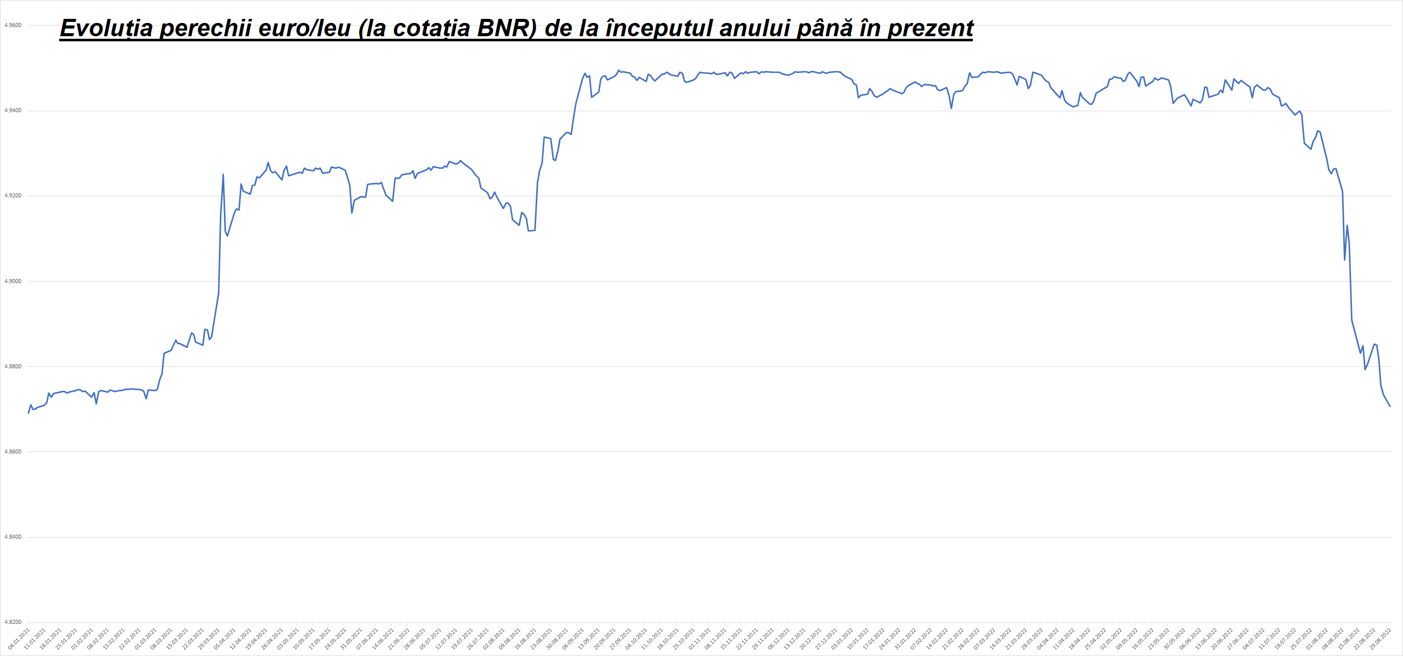 La BNR EUR/RON a fluctuat în intervalul (4,8734 – 4,8853) săptămâna trecută, evidențiindu-se continuarea tendinței de depreciere, spre minimul din februarie .2021. Cursul USD/RON a continuat să se aprecieze, cu 0,6% între 19 și 26 august, la 4,8739. Din perspectiva analizei tehnice cursul EUR/RON ar putea fluctua în intervalul (4,8173 – 4,9117) în perioada imediat următoare.