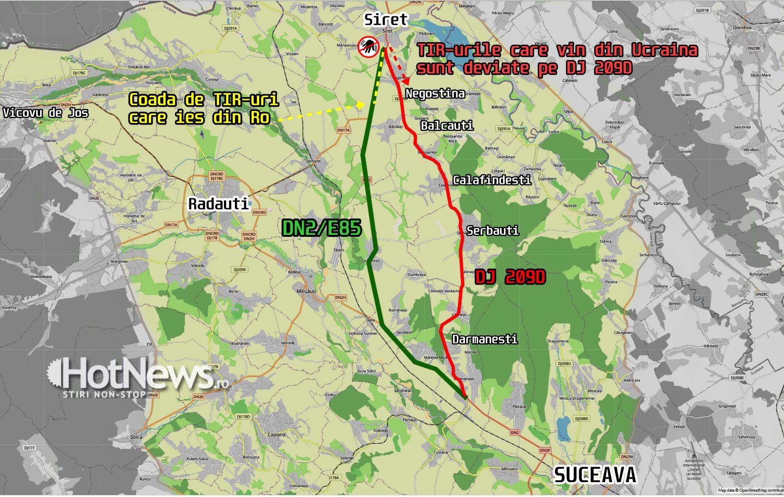 - HotNews.ro a scris joi cum pe DN2/E85, înainte de Siret, camioanele ajung să facă cozi de câțiva kilometri și să blocheze practic o bandă din drumul național. Din cauza aceasta, TOATE camioanele și TIR-urile din Ucraina sunt redirecționate pe un Drum Județean imediat cum ies din Siret, pentru a se evita blocarea completă a DN2 pe cei câțiva de kilometri atunci când e coadă.