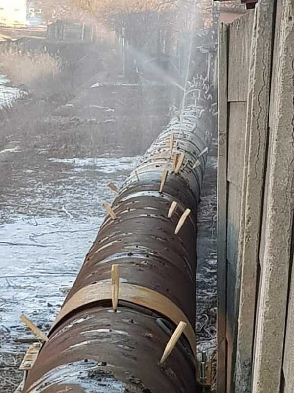 În fotografia devenită virală se observă cum, de-a lungul unui tronson de conductă, spărturile au fost astupate cu bucăți de lemn, iar în unele părţi apa reuşeşte să iasă şi pe lângă aceste improvizaţii.