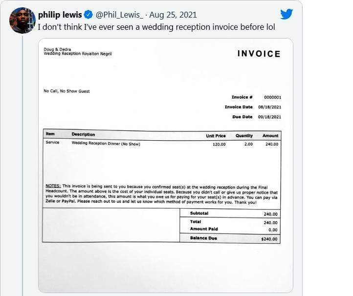 „Aș fi vrut să mă gândesc și eu la asta. O treime din cei care au confirmat n-au apărut la nunta noastră. Am plătit o grămadă de mâncare care a mers la gunoi (chiar dacă a fost mai puțin de $120 tacâmul)”, a scris Jack Barbosa, care este alături de Doug și Dedra. Un altul i-a luat în balon pe furioșii miri: „Sunteți speciali pentru noi, așa că v-am invitat la nunta noastră. Dar nu vom strica aceste sentimente pentru $240 de dolari, dacă n-ați vrut să vi le arătăm. Vă vom trimite însă o invitație la botez, așa că veniți cu cadouri”.
