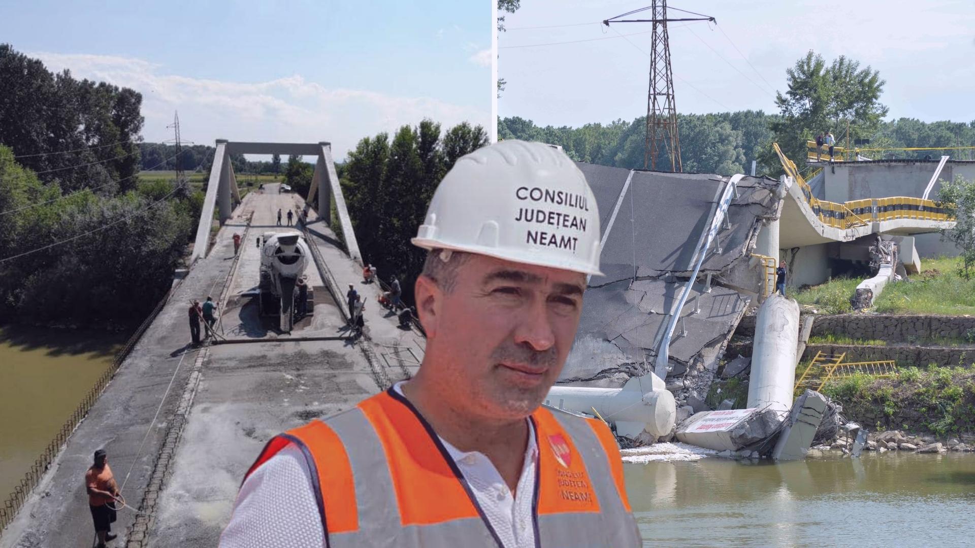 Podul rutier din județul Neamț, cu o lungime de 216 metri, care s-a prăbușit joi, rănind șoferul unui camion care a fost prins sub dărâmături, fusese inaugurat în noiembrie 2021 de către baronul local PSD, Ionuț Arsene. Acesta s-a lăudat atunci că a urmărit îndeaproape proiectul de modernizare al podului și că acesta a trecut toate testele de rezistență, „existând garanția că rezistă unei greutăți de 340 de tone”.