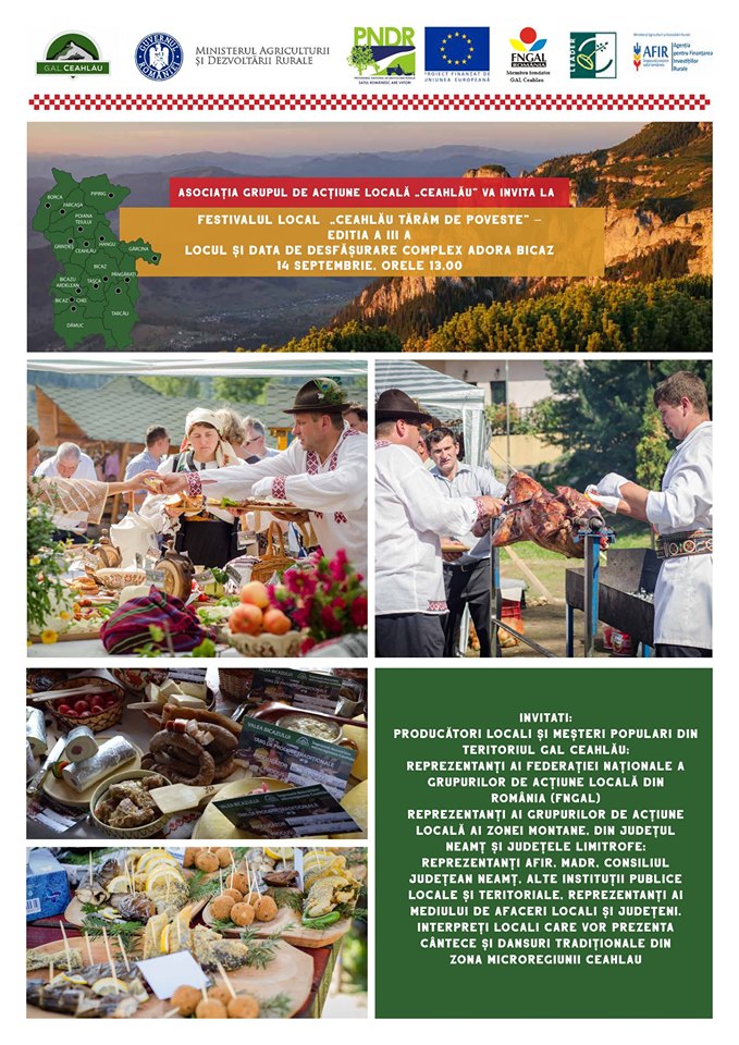 Sâmbătă, 14 Septembrie 2019, începând cu orele 13.00, așteptăm va avea loc cea de a III-a ediție a festivalului local de promovare a produselor tradiționale „CEAHLAU TĂRÂM DE POVESTE” , ce va avea loc la Compex Adora Bicaz – Strada Apusului 26-28, Bicaz.