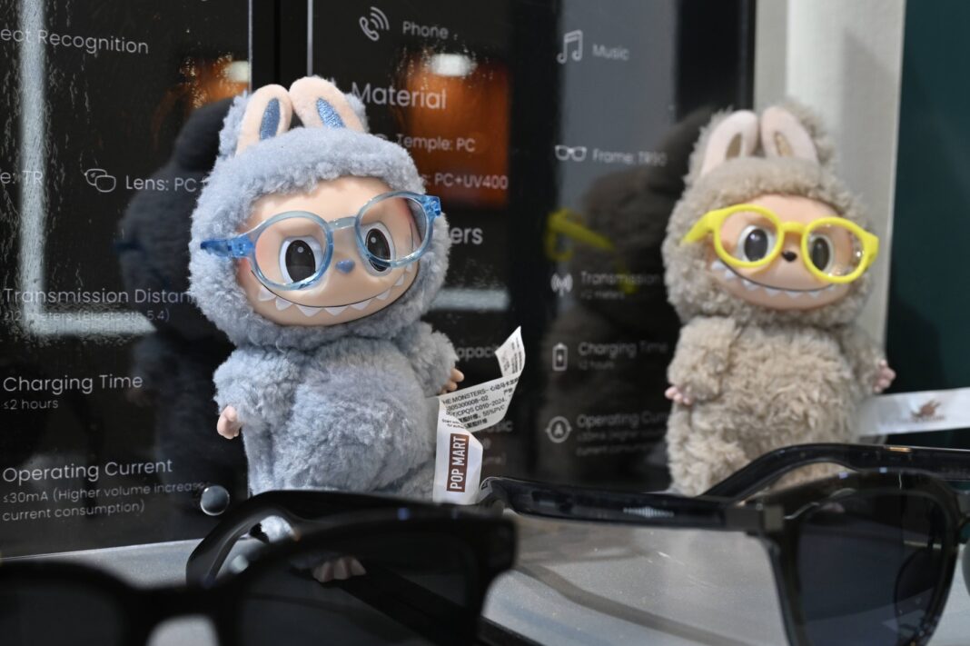Păpuși Labubu purtând ochelari la un târg de optică din Hong Kong. Foto: Kobe Li / imago stock&people / Profimedia.