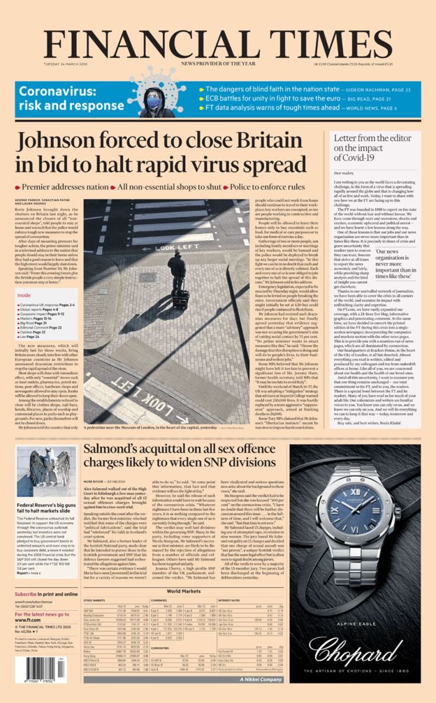 Financial Times: Boris Johnson forțat să închidă Marea Britanie pentru a opri răspândirea rapidă a virusului ● Der Spiegel: Medicii din Europa de Est? Au emigrat! Sistemele de sănătate sunt insuficient pregătite pentru epidemie. Remediul se caută în izolare. Între Baltica şi Balcani viaţa s-a oprit ● Sega: 1.300 de bulgari pe zi rămân fără un loc de muncă. Ministerul Muncii va propune spaţii protejate pentru persoanele care nu pot să lucreze de acasă ● Știri pe scurt.