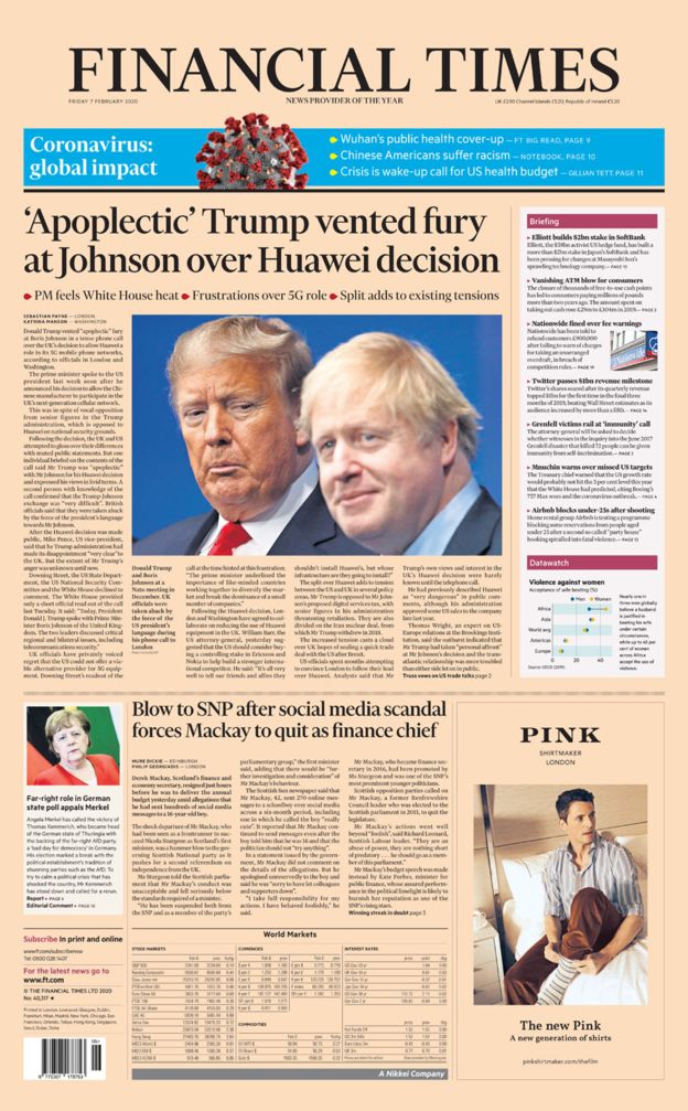 Premierul britanic a vorbit săptămâna trecută cu președintele SUA, la scurt timp după ce și-a anunțat decizia de a permite producătorului chinez să participe la rețeaua de telefonie de viitoare generație din Marea Britanie. O persoană care a dat detalii despre conținutul apelului a cnfirmat tonul „apoplectic” al dlui Trump în timp ce un al doilea oficial a confirmat că apelul Trump-Johnson a fost „foarte dificil”. Oficialii britanici apropieți ai administrației au spus și ei că limbajul președintelui american a fot unul foarte colorat.