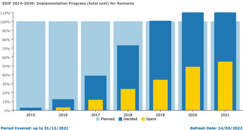 Nu e clar ce sume au fost realocate în acest mod, dar în 2017, România decisese ce să facă doar cu 39% din fondurile structurale. La finalul 2021, raportul decis/planificat (bugetat de UE) era de 152%. Iar România, a patra din coadă la absorbție.
