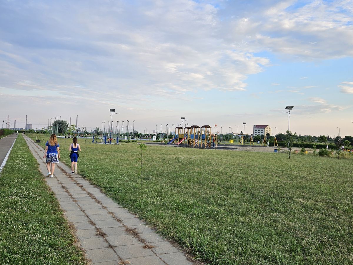 Pe zona verde iarba este tunsă, băncuțele și mesele de piatră sunt vopsite, nu este iarbă între dale și NU sunt grămezi de gunoaie în parc. Există și terenuri de sport, dar și pistă cu rampe și obstacole, pentru role, biciclete și trotinete. Iarna funcționează și un patinoar și parcul este luminat foarte puternic noaptea.