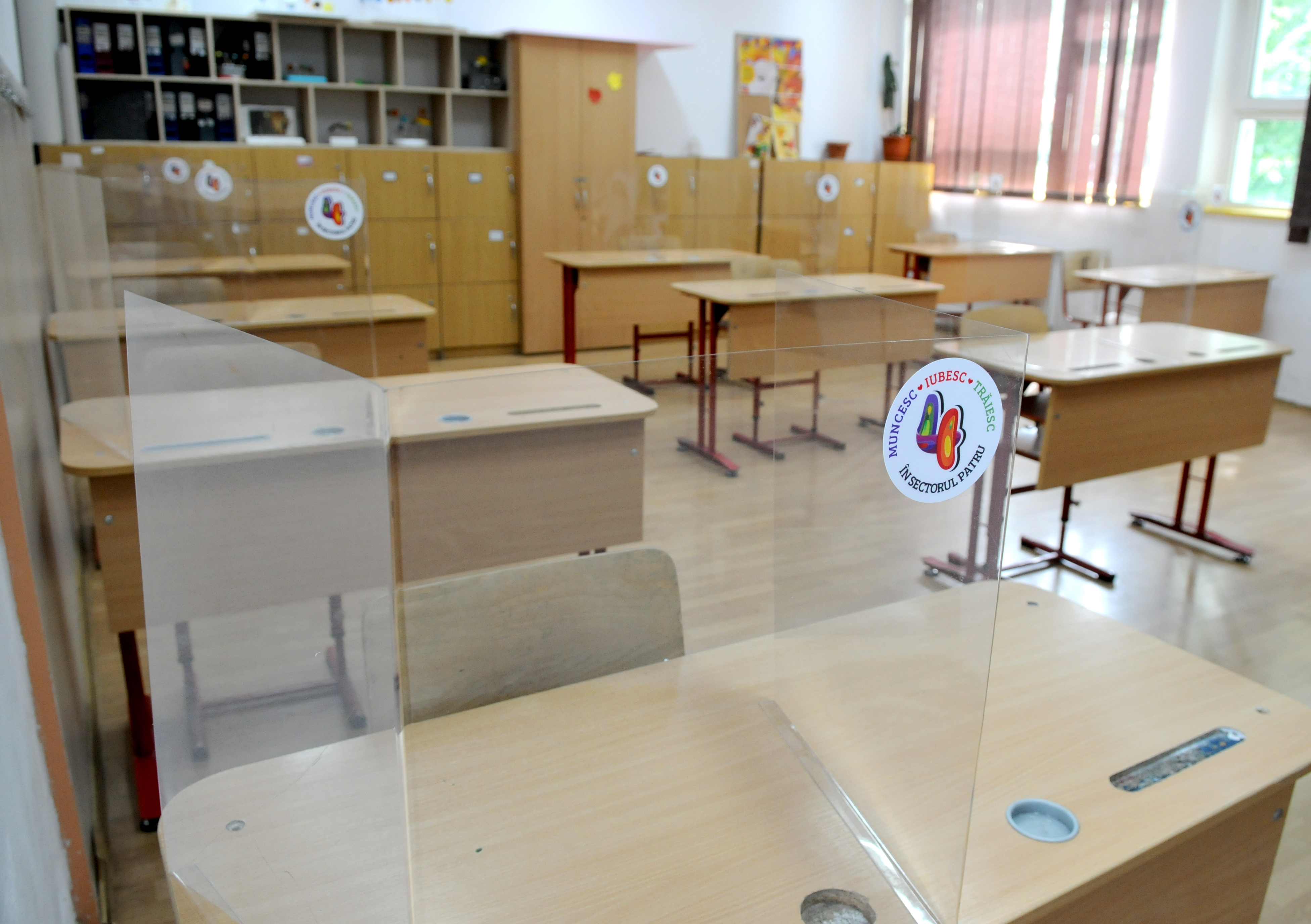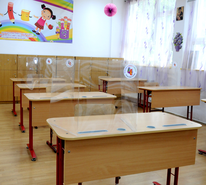 ⦁ Între bănci a fost asigurată o distanță de aproximativ 2 metri, iar pupitrele au fost dotate cu geamuri de plexiglas.