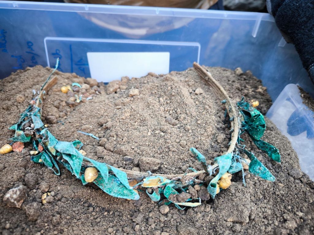 Ce s-a descoperit? Podoabe de aur, sticlă și bronz, din care se remarcă trei cununi funerare cu frunze din bronz aurit ce imită forma celor de mirt și iederă, montate pe suport de lemn, cu fructe realizate din ceramică aurită,