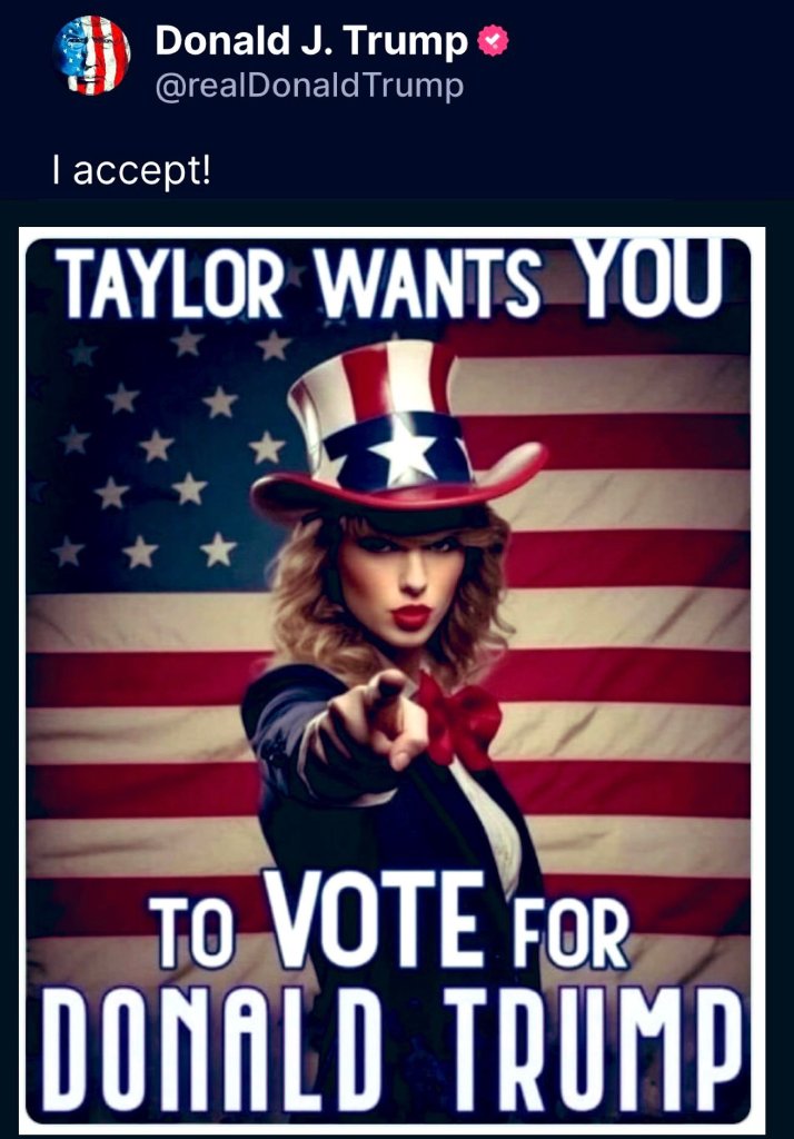 O postare de duminică a candidatului republican pe reţeaua proprie Truth Social o arăta pe Taylor Swift în rol de Unchiul Sam, cum un mesaj care spune: „Taylor vrea ca tu să votezi cu Donald Trump”.