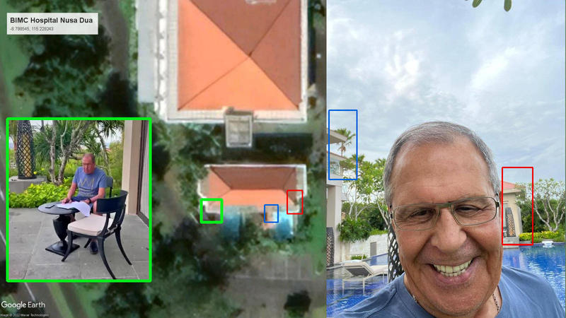 O imagine în acest sens a fost distribuită pe pagina sa de Twitter de Timmi Allen, unul dintre membrii echipei de investigatori ai Bellingcat, aceasta arătând cum jurnaliștii independenți au reușit să identifice locația lui Lavrov, folosind imagini din satelit, pe baza filmării și a unei fotografii distribuite de ministerul rus de Externe.