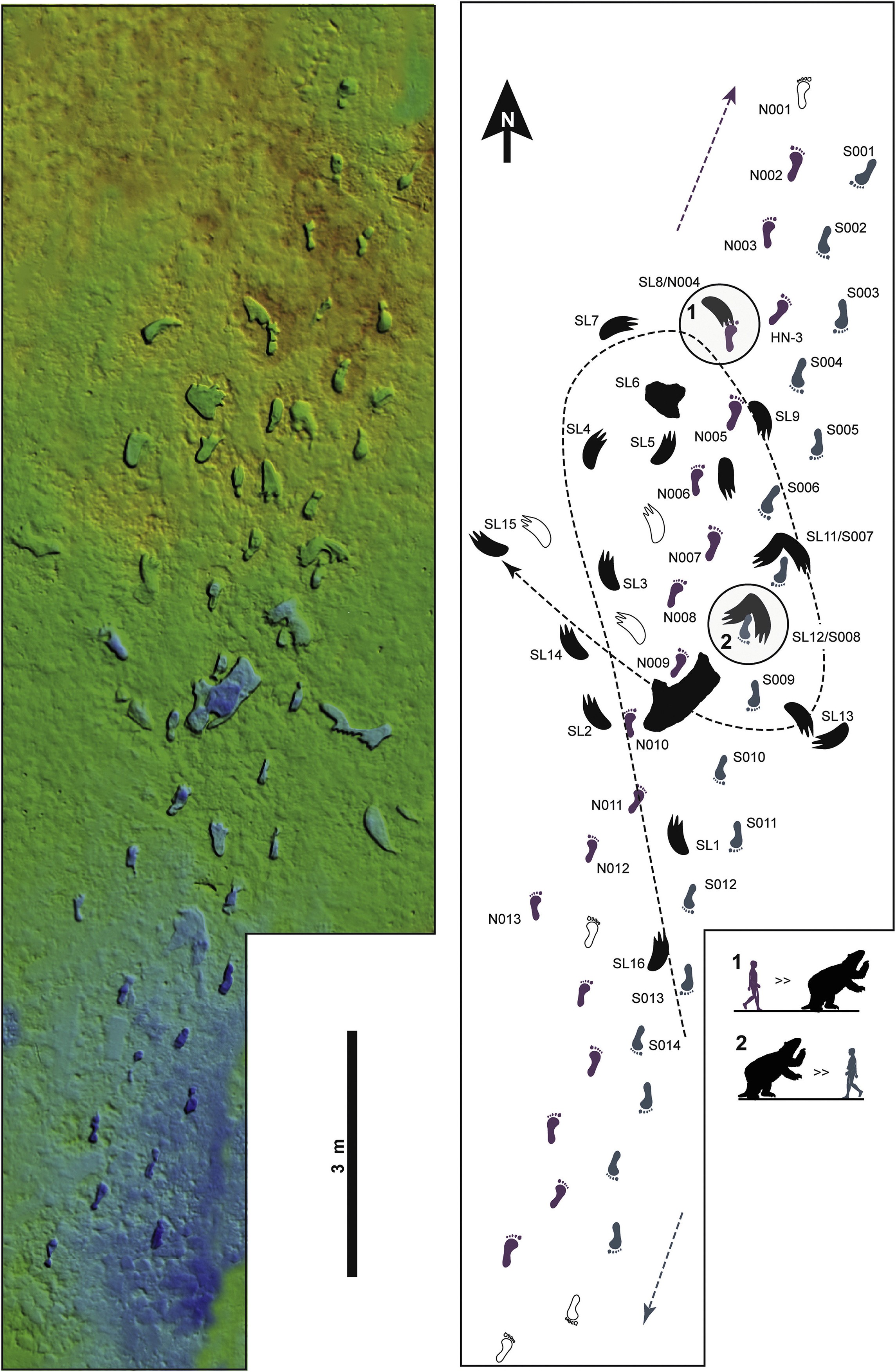 În timpul drumului ei dus-întors, alte urme, de leneș gigant, de mamuți și de Smilodon (felină cu dinți sabie) au trecut prin calea ei, iar leneșul gigant a fost ademenit de mirosul femeii.