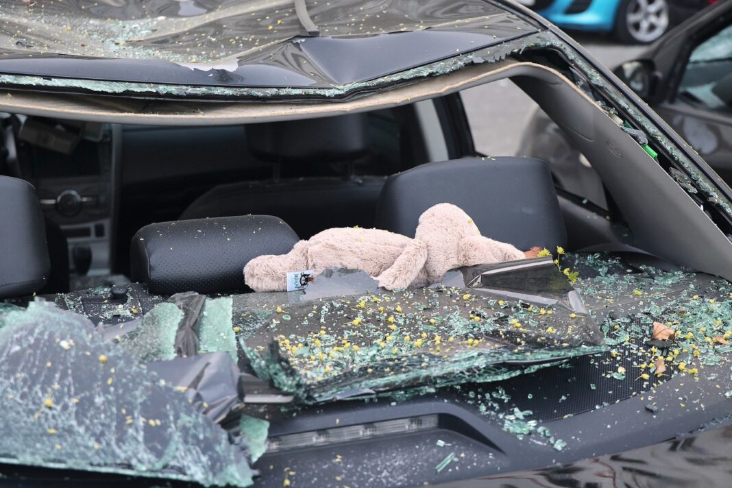 O jucărie de pluș, într-o mașină avariată în urma atacului cu rachete balistice rusești efectuat în Harkov, Ucraina, pe 18 aprilie 2025.