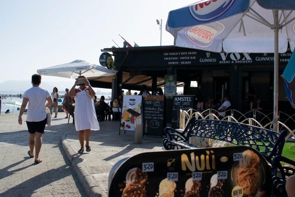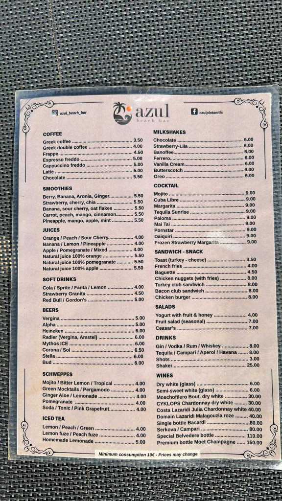 La câteva minute de plajă, există magazine, restaurante și beach baruri de unde turiștii își pot cumpăra băuturi răcoritoare, alcoolice și mâncare. Un frappe costă între 20 și 24 de lei și o bere la draft e 12 lei.