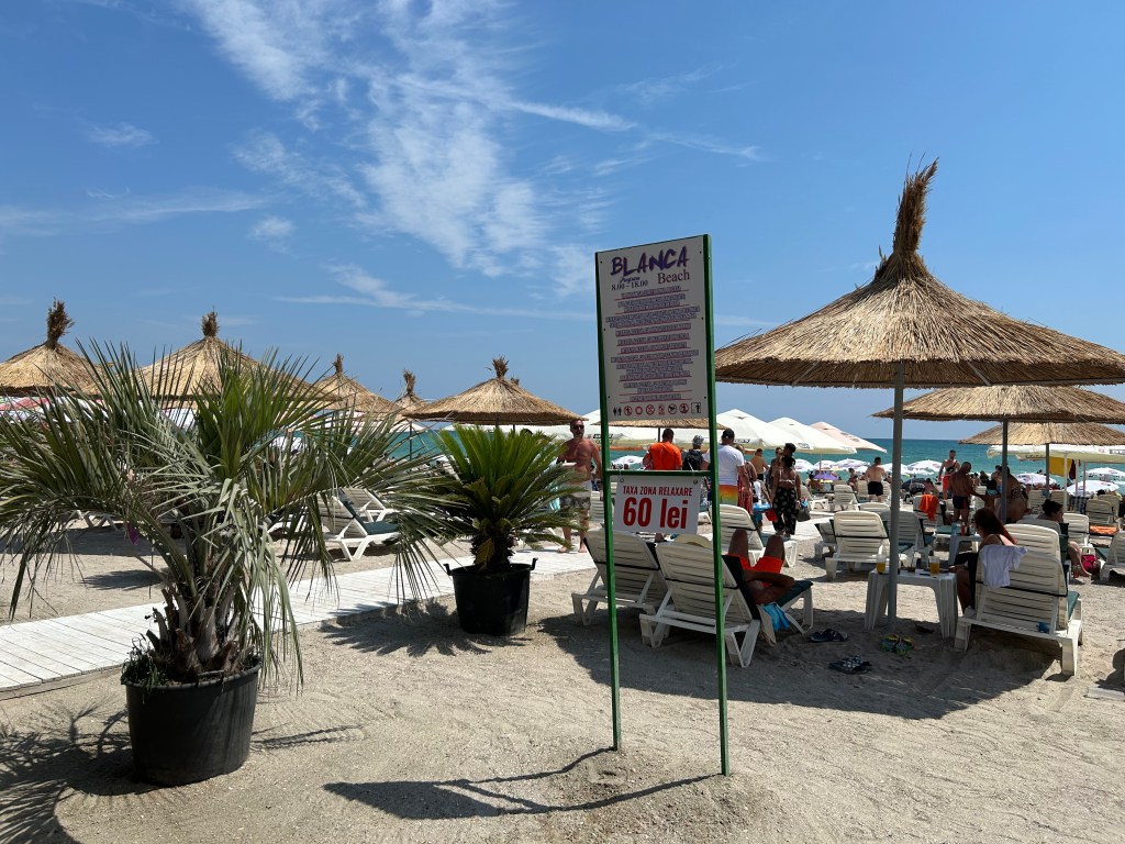 În Mangalia, plaja este mai mică comparativ cu celelalte stațiuni. Cu toate acestea, păstrează prețul pentru șezlonguri: 40 de lei de luni până duminică. Tariful include un șezlong și umbrelă.