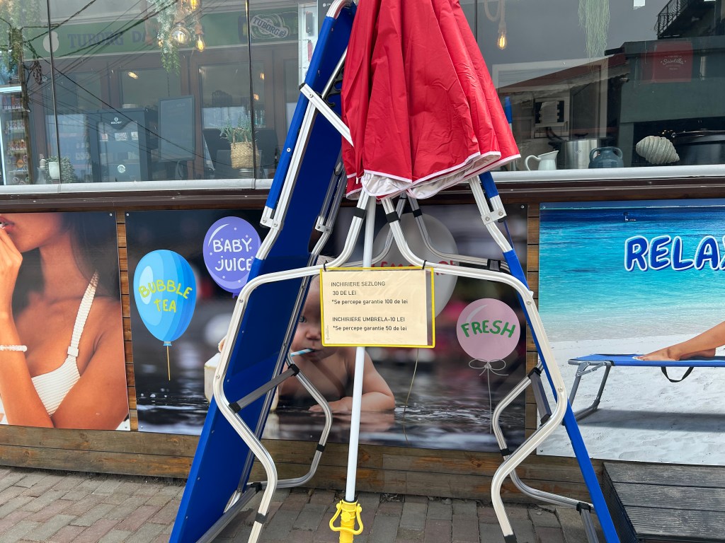 Tot pe plaja din Vama Veche, de pe strada principală a stațiunii, poți să închiriezi un șezlong cu 30 de lei și o umbrelă cu 10 lei. Numai că se percepe și o taxă de garanție a sezlongului și a umbrelei, de 100, respectiv 50 de lei, bani pe care îi vei primi înapoi la finalul zilei. Deci, un turist care vrea să închirieze atât un șezlong, cât și o umbrelă, va scoate din buzunar suma de 190 de lei.