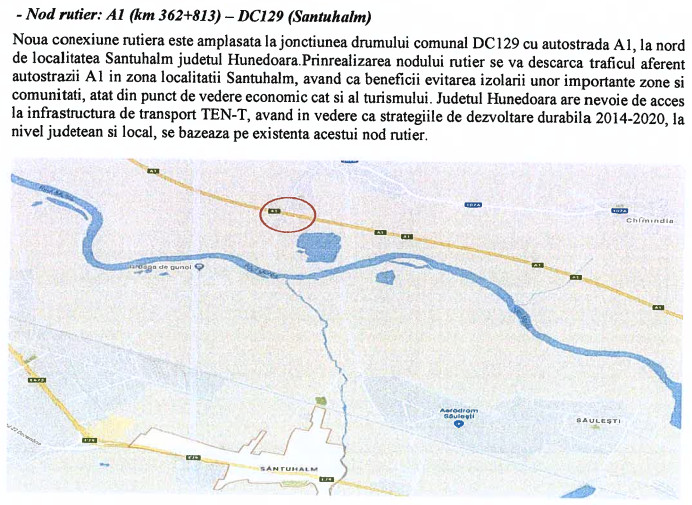 „Nod rutier la Sântuhalm, la joncţiunea DC129 cu Al, în Judeţul Hunedoara. Marele beneficiu este conectarea la rețeaua de transport TEN-T a unor zone spre care, momentan, accesul este dificil. Astfel sunt susținute economia și turismul local, pentru dezvoltarea durabilă a regiunii”, notează Drulă.