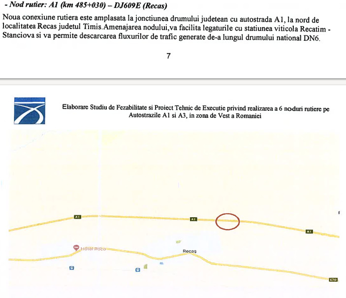 „Nod rutier la Recaș, la joncţiunea drumului judeţean DJ609E cu A1, în Județul Timiș. Sunt facilitate atât legăturile cu stațiunea viticolă Recatim – Stanciova, cât și descărcarea fluxurilor de trafic de pe DN6”, spune Cătălin Drulă.
