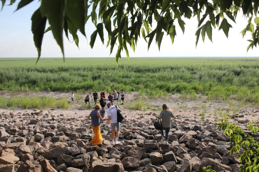 Jurnaliști pe iunie 2024, la un an după distrugerea barajului Nova Kahovka, pe locul unde era lacul de acumulare / FOTO Tarasov / Zuma Press / Profimedia