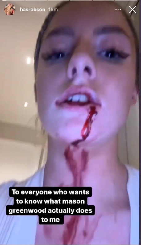 „Pentru cine vrea să știe ce îmi face Mason Greenwood” – a fost mesajul lui Harriet Robson pe Instagram însoțit de mai multe imagini cu ea lovită și învinețită.