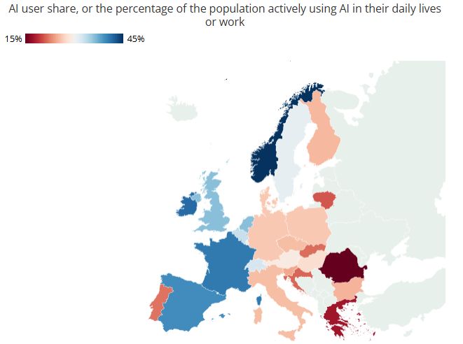 În prezent, Uniunea Europeană (mai ales țările sale cele mai bogate) se află în fruntea adoptării inteligenței artificiale, potrivit raportului. Un clasament al țările unde AI este cel mai bine integrată în viața de zi cu zi arată că Irlanda conduce blocul, cu 41,7%. Urmează Franța (40,9%) și Spania (39,7%)