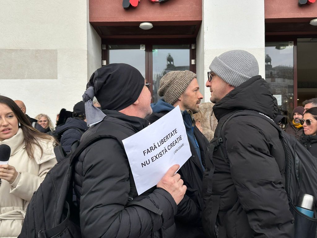 Manifestația a fost anunțată luni, după ce ministrul Culturii a transmis că vrea să normeze munca artiștilor. Artiștii de la TNB au reacționat, protestând, marți, cu pancarte, în fața instituției.