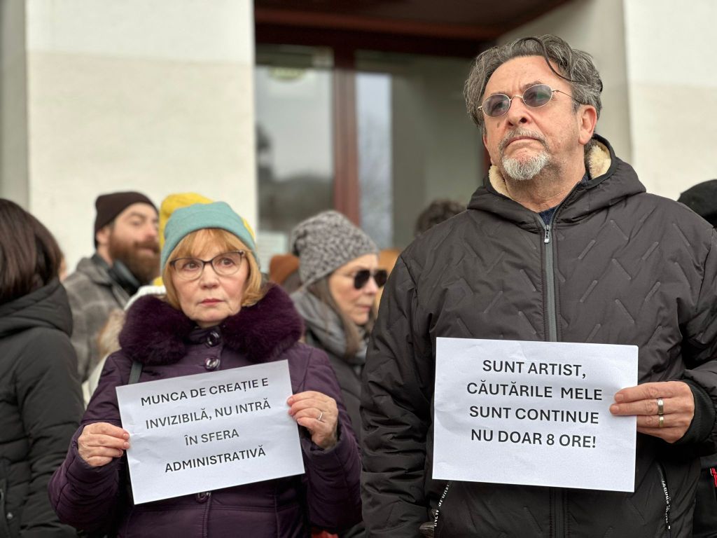 Zeci de actori și angajați ai Teatrului Național din București protestează, marți, după ce Ministerul Culturii a propus normarea timpului de muncă pentru artiști. Ei afișează mesaje precum „Sunt artist, creez liber, nu în program fix” sau „Constrângerea și supunerea omoară libertatea de expresie”. La manifestație a venit și ministrul Culturii, András Demeter, care a anunțat că retrage proiectul pilot.