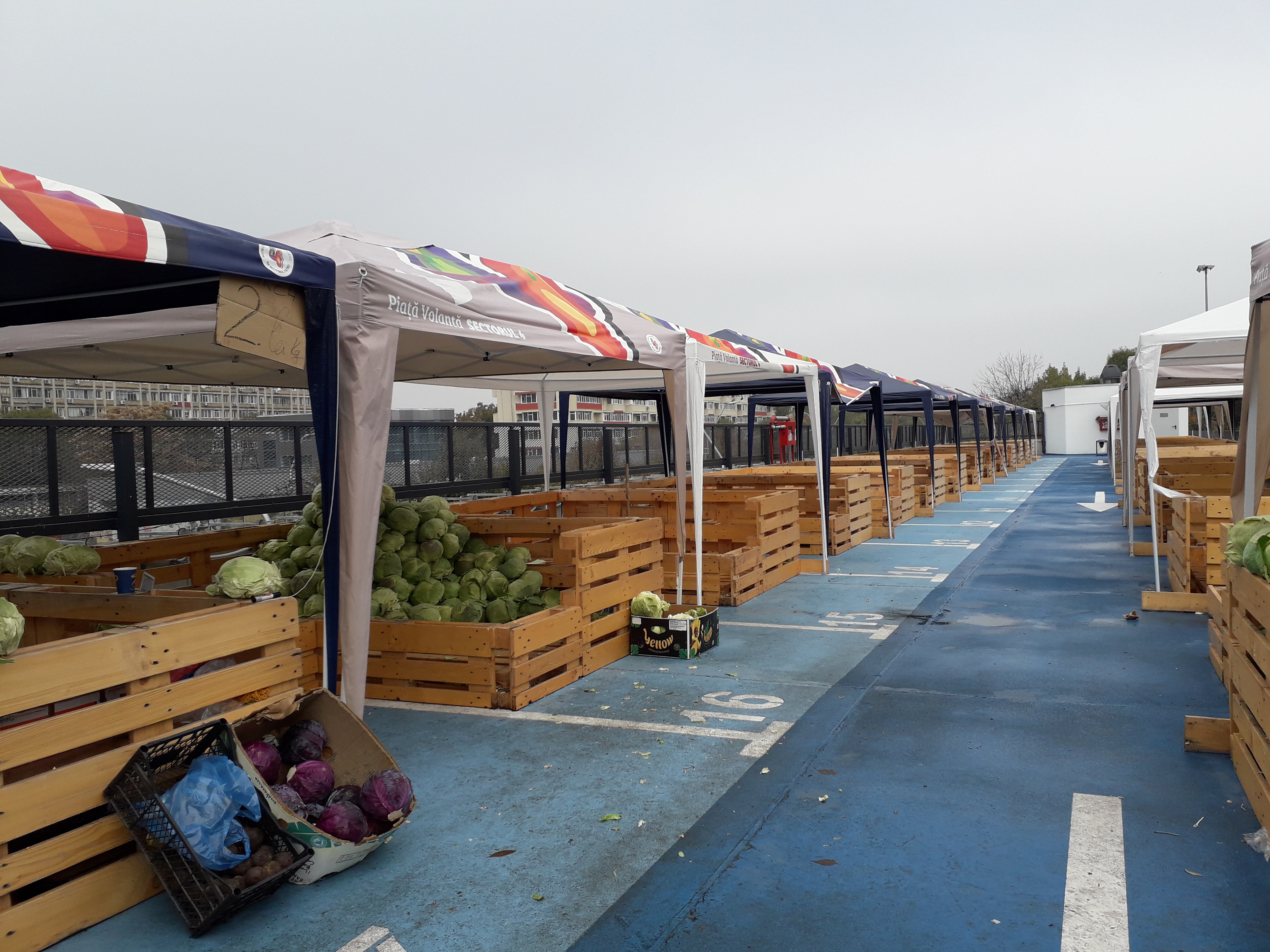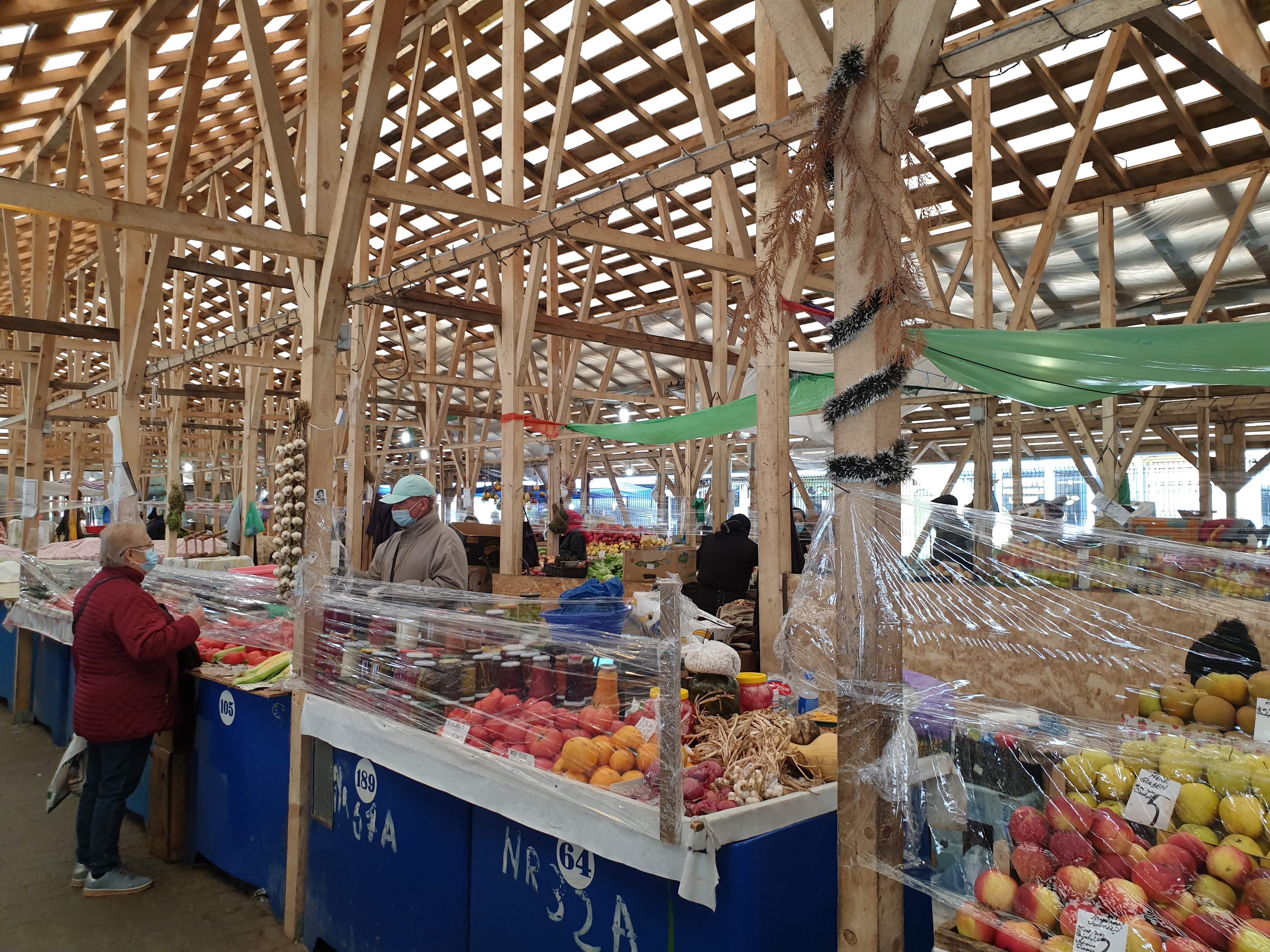 Acolo, o parte din producători s-au mutat afară, în parcarea din spatele sau din lateralul pieței (depinde cum privești). Vânzători puțini, cumpărători la fel.