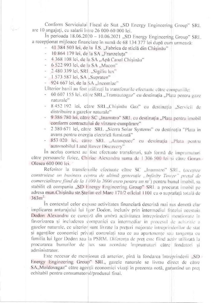 În cauză, e vorba de întreprinderea „SD Energy Engineering Group”, cu sediul în Ialoveni, controlată din umbră de fratele lui Igor Dodon. Potrivit notei informative, compania procură gaz de la „Transautogaz” SRL la prețul de 4,06 lei pentru un metru cub, inclusiv cheltuielile pentru transport. Ulterior, gazul este livrat la un preț mai mare către diverși agenți economici, preponderent întreprinderi de stat, acestea fiind astfel prejudiciate.