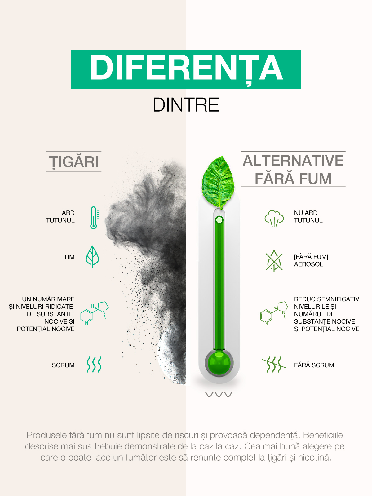 Atunci când tutunul dintr-o țigară este ars, se produc peste 6.000 de substanțe, dintre care experții în sănătate publică au identificat aproximativ 100 ca fiind cauzele bolilor asociate fumatului. Tot în urma arderii rezultă și gudronul. Acesta nu este o substanță chimică, ci totalitatea reziduurilor solide din fumul de țigară. Alternativele fără fum nu ard tutunul, iar aerosolul generat de aceste produse este fundamental diferit de fumul de țigară. Prin urmare, acestea nu produc nici gudron. Așadar, dacă eliminăm arderea, expunerea la un număr mare și niveluri ridicate de substanțe nocive și potențial nocive substanțele nocive și potențial nocive poate fi redusă semnificativ în comparație cu fumul de țigară.