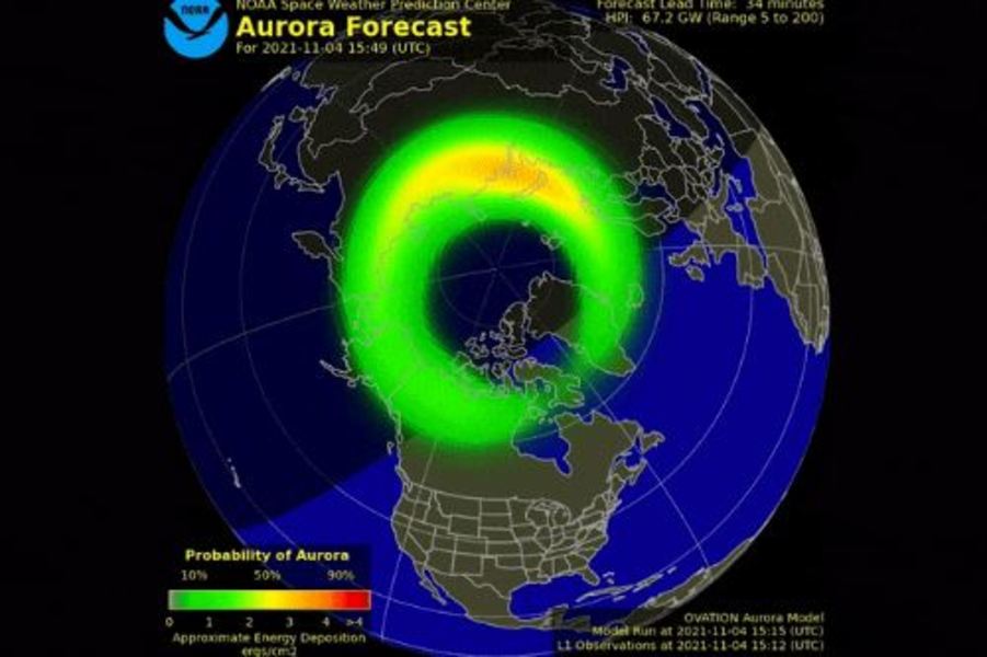 Centrul de predicție a vremii spațiale oferă, de asemenea, o prognoză de 30 de minute a activității aurorale care arată locația și intensitatea aurorei.