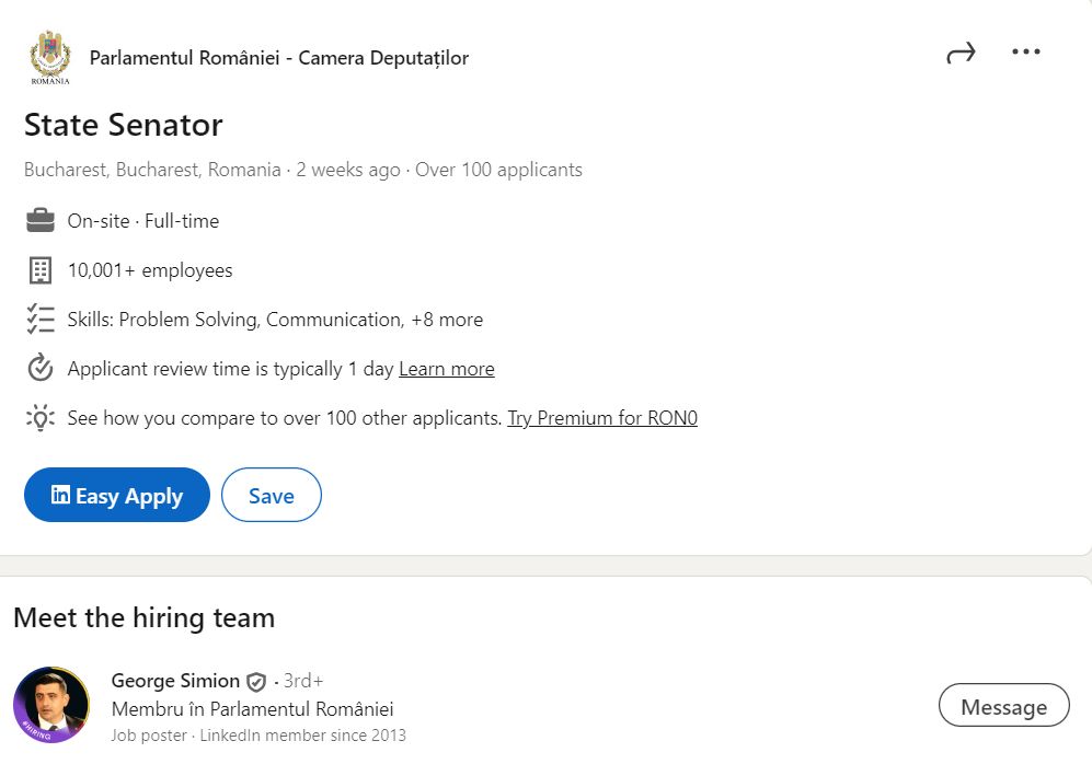 Anunțul de recrutare a fost postat de pe contul oficial, care este verificat de către platformă, al lui George Simion în urmă cu două săptămânii, iar, până la momentul publicării acestei știri, peste 100 de persoane au aplicat.