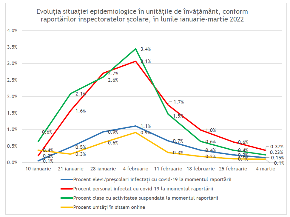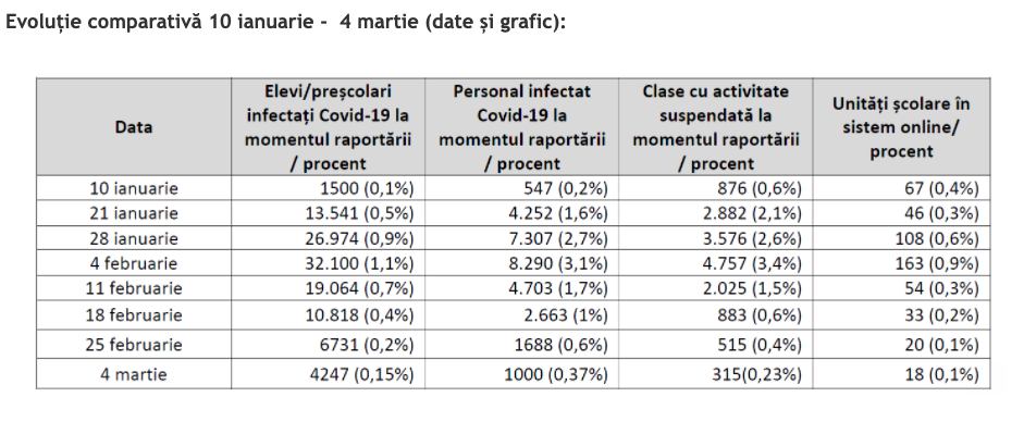 Peste 4200 de elevi și preșcolari și 1000 de angajați din învățământul preuniversitar au fost confirmați pozitivi cu Covid-19 în perioada 28 februarie – 4 martie, un bilanț în scădere față de săptămâna anterioară.