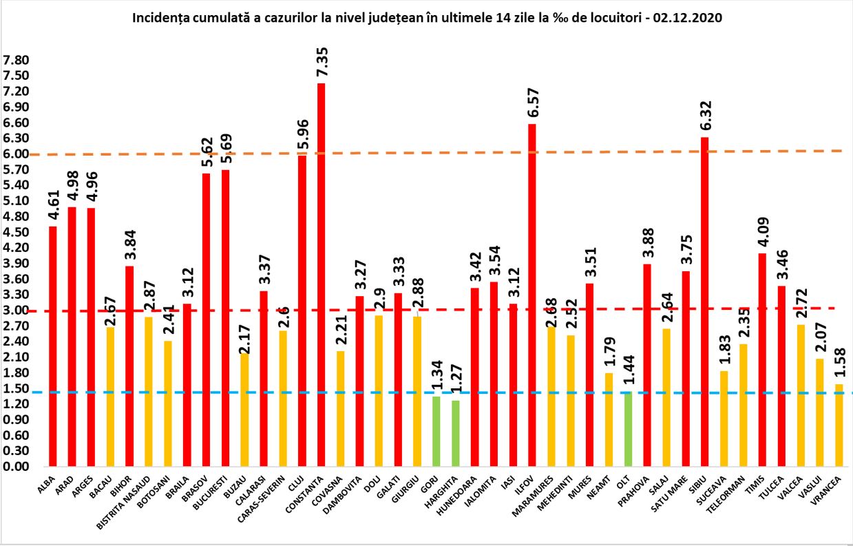 Peste 6 cazuri la mia de locuitori în ultimele zile au rămas județele Constanța – 7,35, Ilfov – 6,57 și Sibiu 6,32, potrivit datelor furnizate miercuri de autorități.