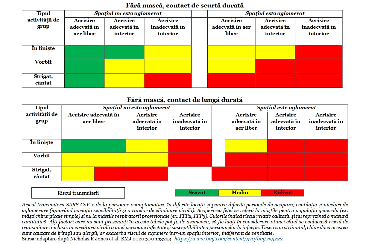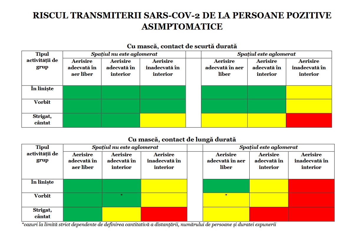 Astfel, dacă un asimptomatic are mască și contactul e de scurtă durată, prezintă risc mediu de transmitere prin strigăt sau cântat într-un spațiu neaglomerat în care aerisirea este inadecvată în interior, notează Mediafax.