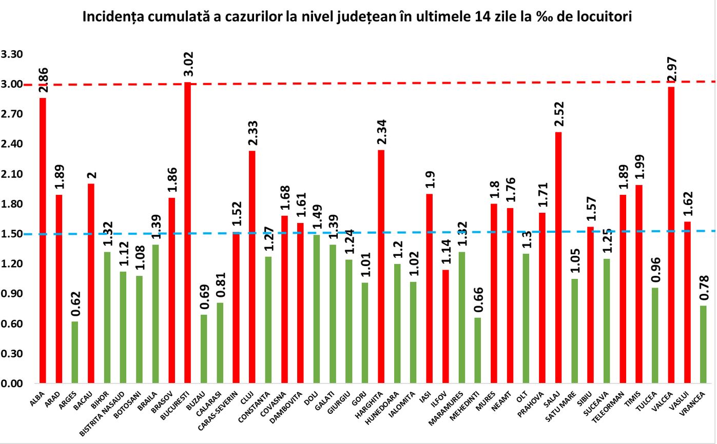Cele mai mici incidențe cumulate sunt în Argeș (0,62), Mehedinți (0,66) și Buzău (0,69).