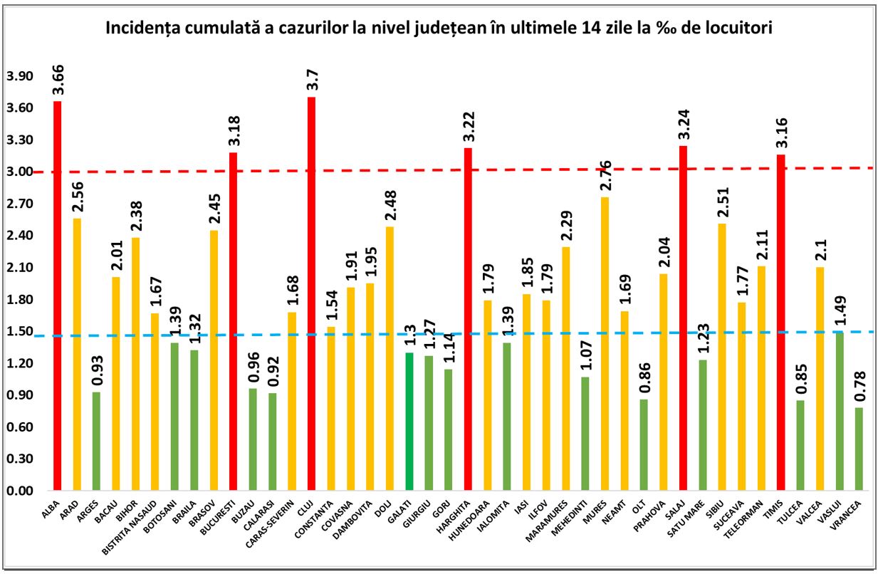 Incidența rămâne peste pragul de 3 la mie după care se impun noi restricții în județele Alba – 3,66 (ieri era 3,75), Cluj – 3,7 (3,51), Hargita – 3,22 (3,33), Sălaj – 3,25 (3,16) și Timiș – 3,16 (3,02)