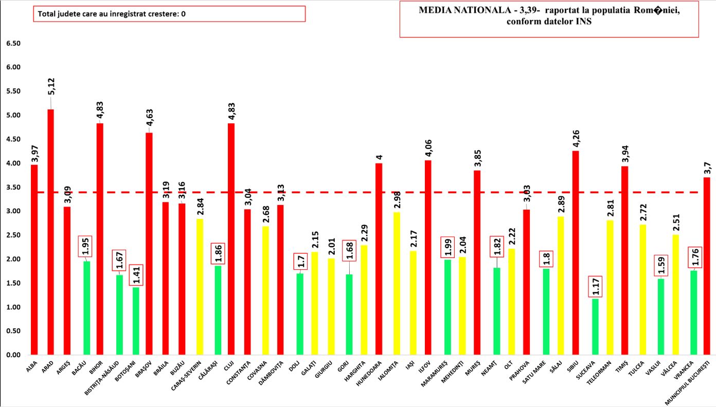 Un număr de 12 județe se află în zona verde, cu o incidență sub 2 la mie, cea mai mică fiind raportată în Suceava – 1,17 la mie.