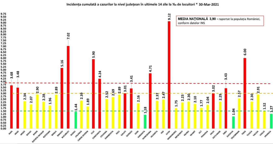 Incidența cazurilor de coronavirus este pragul de 3 la mia de locuitori în București și 12 județe, în zona roșie intrând, față de luni, și județul Galați potrivit datelor furnizate marți de Grupul de Comunicare Strategică.